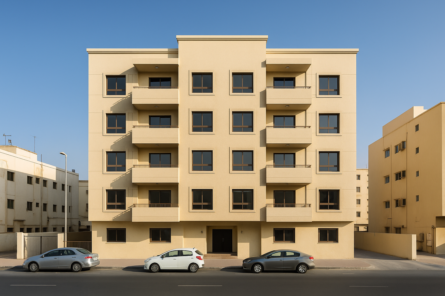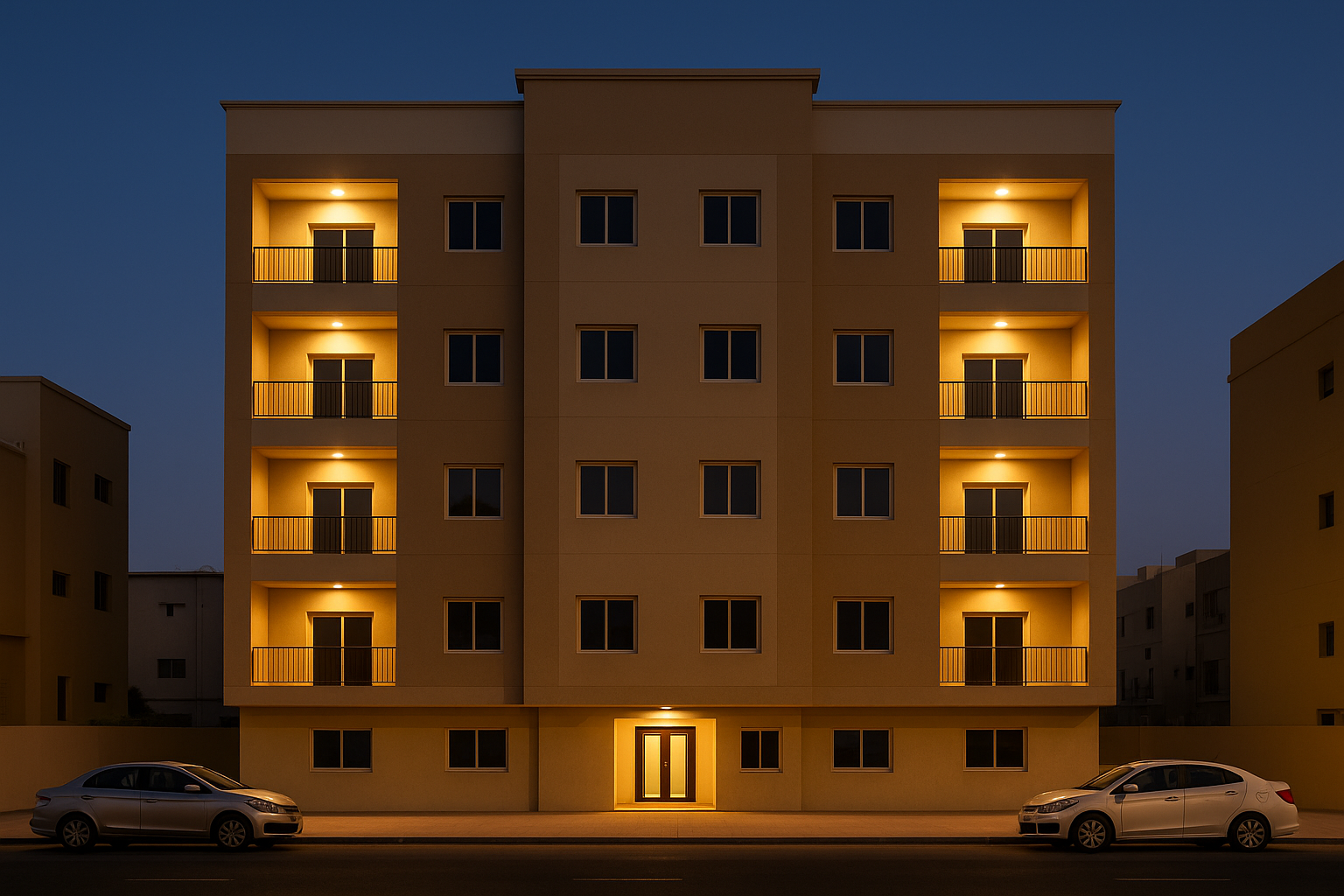 The project used locally sourced materials to ensure quality control and timely delivery. Finishing elements such as textured plaster, neutral tones, and coordinated glass panels created a cohesive residential identity while maintaining low maintenance costs.