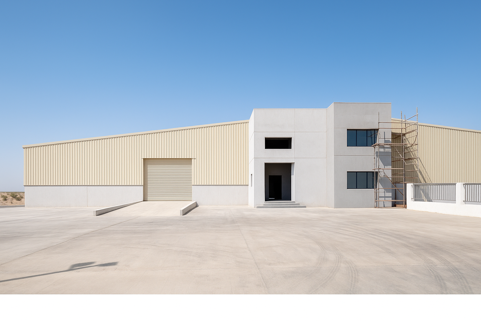 The warehouse structure offers optimized internal clear heights for storage flexibility, while the attached office enables seamless coordination between management and logistics. Natural lighting and mechanical ventilation systems were strategically integrated to enhance usability and reduce energy demand.
